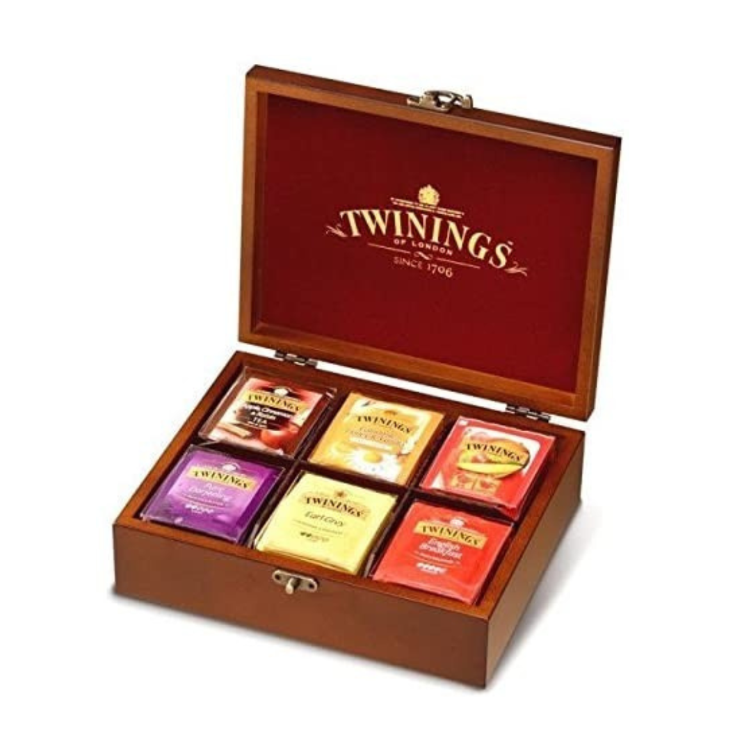 1 Caja de 8 compartimentos + 2 Tazas Twinings con platillos + 1 Tetera Twinings + 160 bolsitas de té con surtido de tés, infusiones y manzanillas; y un mini expositor Twinings