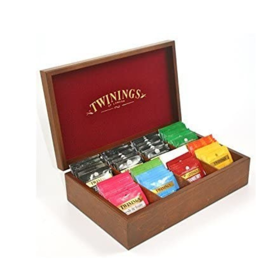 1 Caja de 8 compartimentos + 2 Tazas Twinings con platillos + 1 Tetera Twinings + 160 bolsitas de té con surtido de tés, infusiones y manzanillas; y un mini expositor Twinings